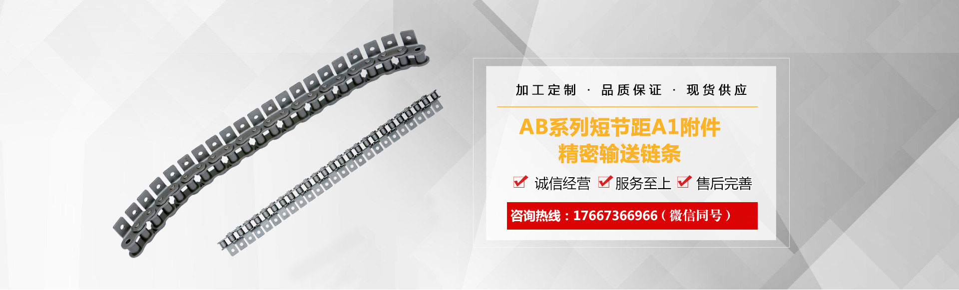 1、鏈條產品有各種不銹鋼、碳鋼輸送鏈條、雙節距輸送鏈條、空心銷軸鏈條、不銹鋼塑料平頂鏈、不銹鋼精密滾子鏈、特殊工礦輸送鏈、耐高溫輸送鏈條、非標鏈條、彎板非標鏈條、大節距輸送鏈條、各種鏈條用滾子(材質碳鋼、不銹鋼)等。
